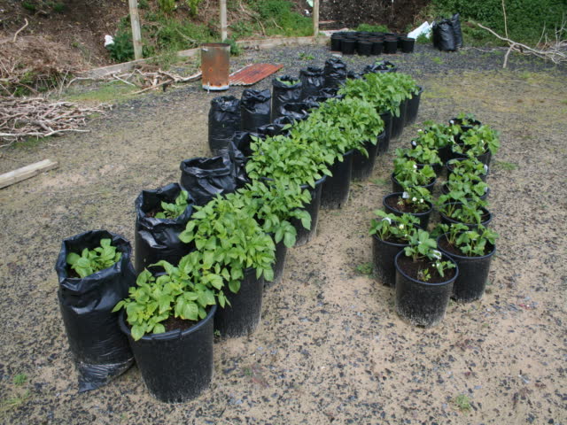 The potatoes for this year are being grown in bags and tubs and if they do well it may be the way to grow them each year as the preparation is so much easier and the cropping should less work as well. These are looking as in the photo below: