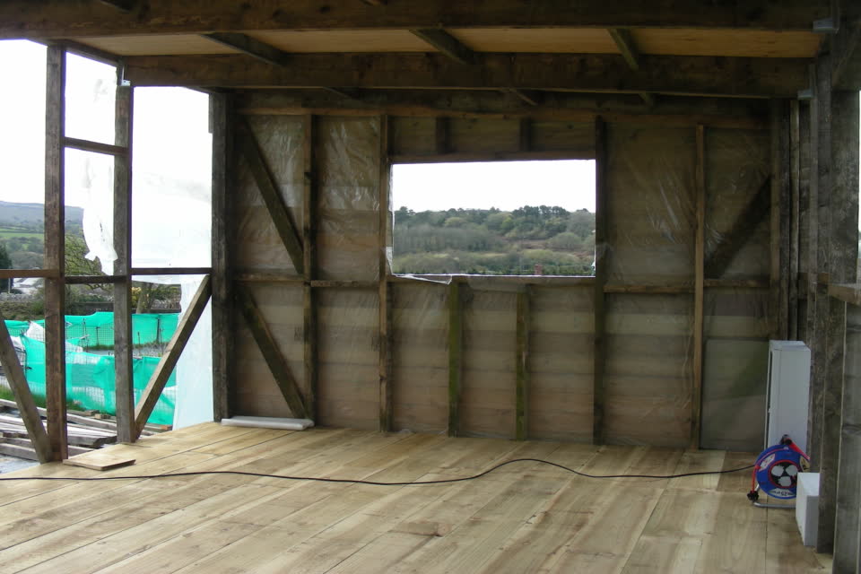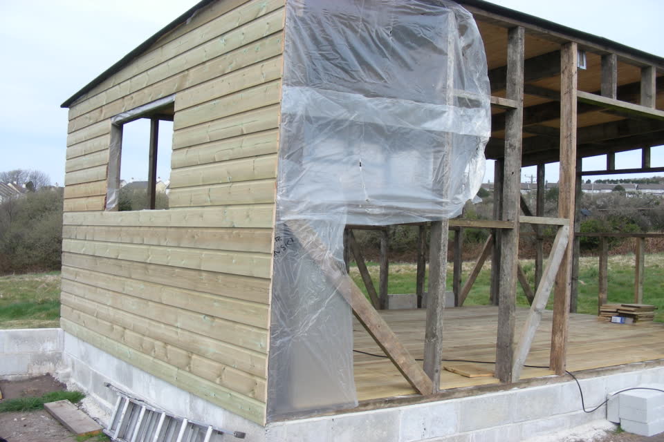 Here the wooden floor has been laid and the cladding is being done to make it more weatherproof. The roof has already