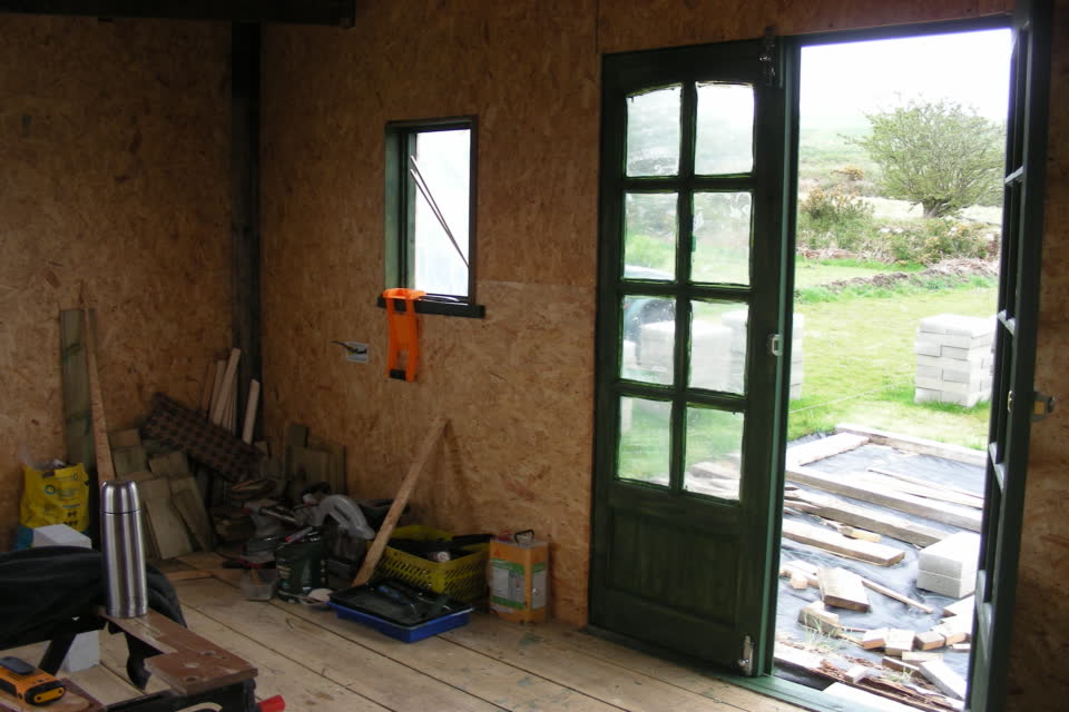 From these photos you can appreciate the speed at which the hut is taking shape and as each task is completed it gives us a bolt-hole if the weather turns less clement, which out here in Cornwall, is quite often. The electrics are now completed with 6 double plug sockets and two LED strip lights for those dull and cloudy days. Later on when the windows have been glazed fully when Paul makes the frames that will complete the weatherproof aspect and the Internet cable and telephone can be connected and used as if we were sitting indoors in the house.