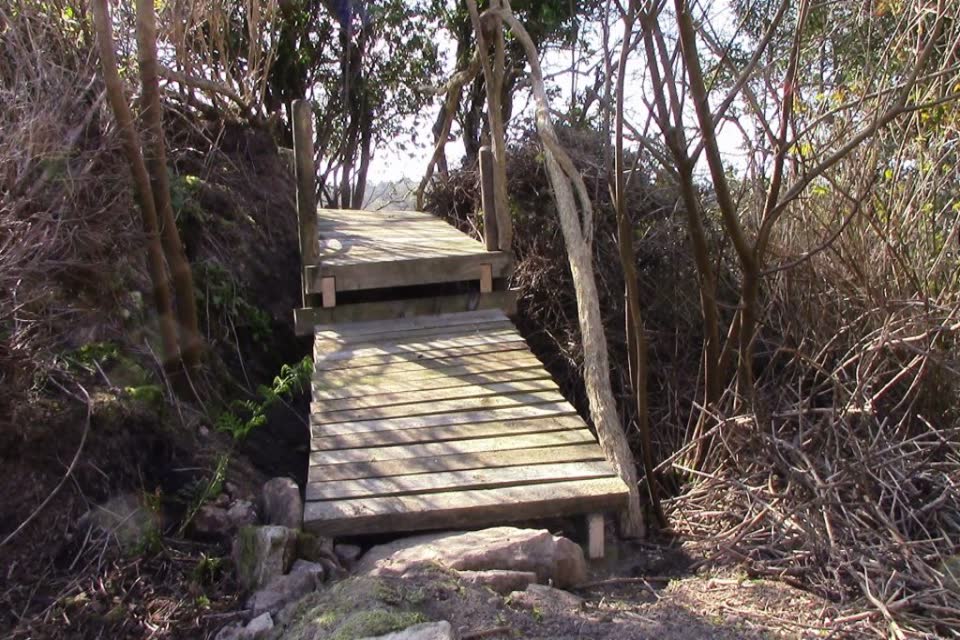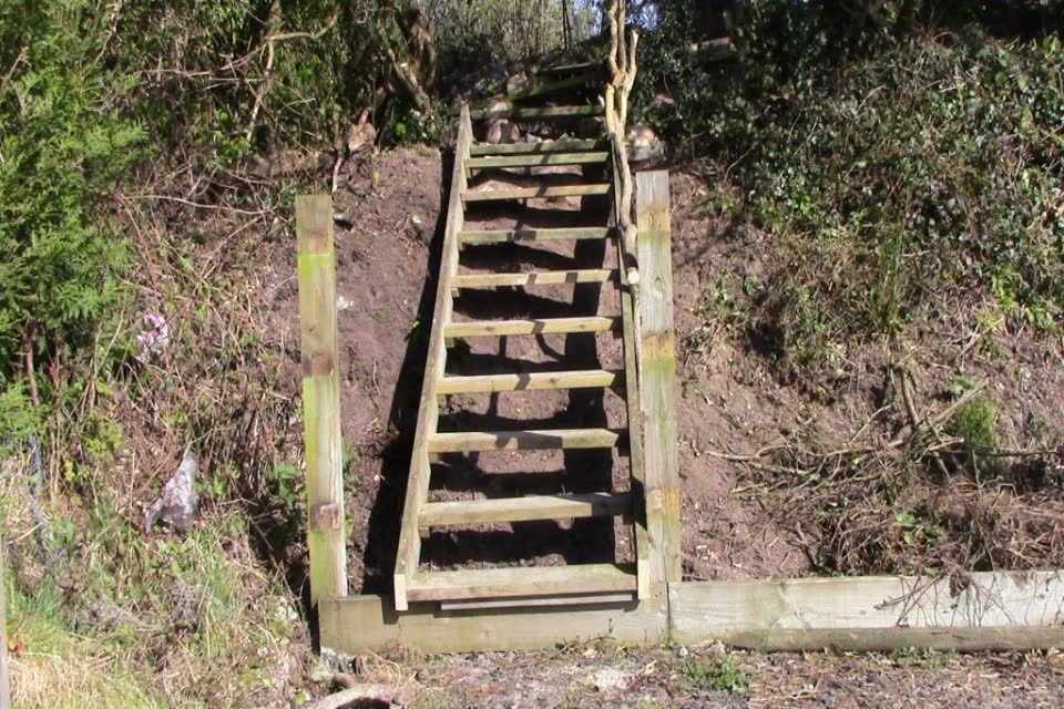 As you can see from the photo above, it is very overgrown with a large mixture of plants and brambles. Below is a photo of the same corner with the undergrowth removed and the stairs built to the pathway.