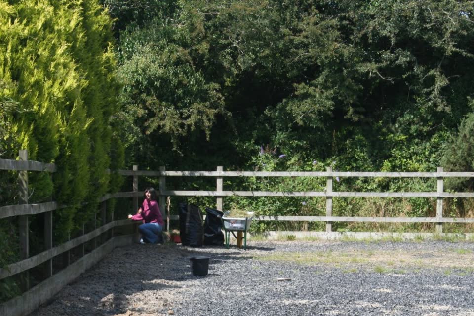 Rearview of the sand-ring with all the undergrowth behind the fence.