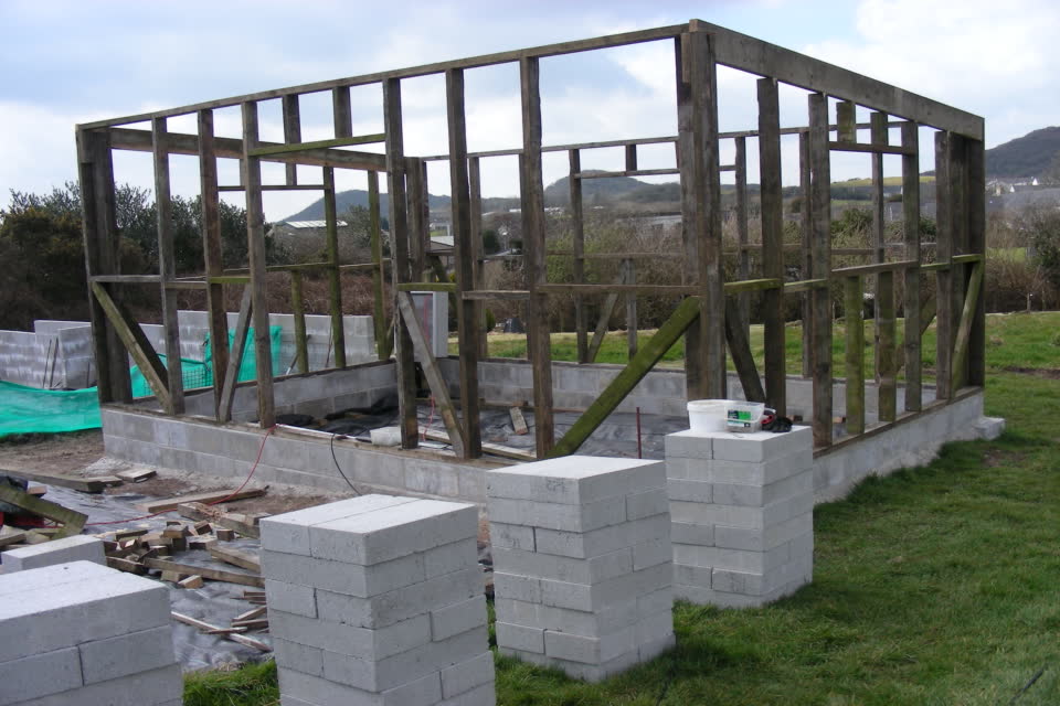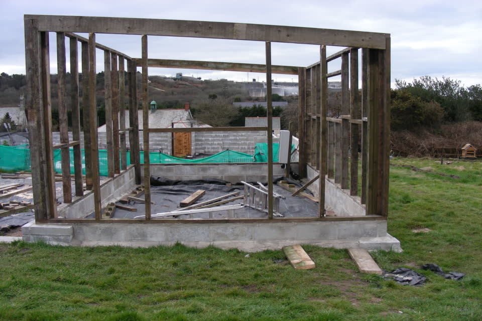 As you can see from the photo above, the completed foundation will support the floor of the hut a foot or so off the ground to avoid any damp problems. The corner posts have been secured and as the frame builds up it will become more sturdy and strong. The box you see through the frame holds the electrics, internet feed, and telephone cable. These will be installed once the hut exterior is complete and services will allow us to keep in touch and even work on our website whilst up in the fields, cool huh!