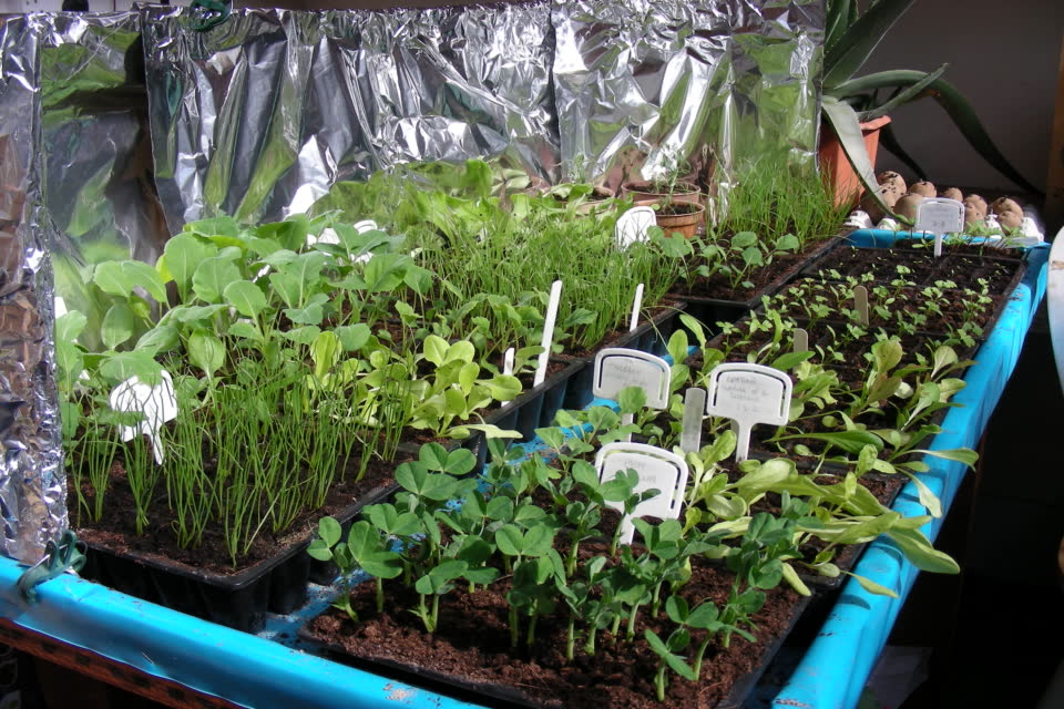 Some of the baby seedlings Loraine has been growing on in the workshop. Many are close to being planted out for