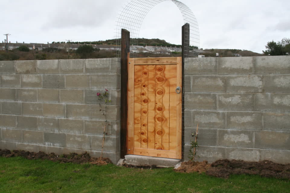 Main Gate to the walled garden area with a bespoke wooden gate fitted with heavy-duty hinges and twisted ring latch.