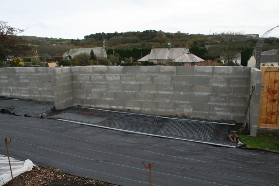 This view of the South wall is from the inside of the growing area and we have placed weed suppressant down to stop