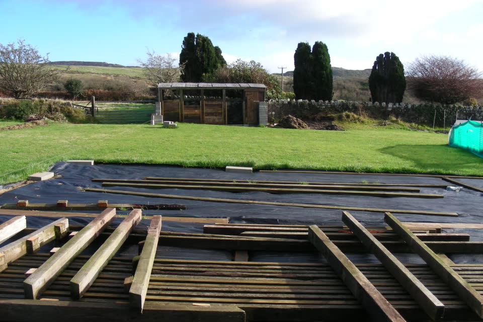 Upon this foundation, two courses of heavy concrete blocks will be laid to take the hut off the ground to keep it nice and dry. One trench has been dug out and leveling pins placed along it, now the other three sides need to be done then the concrete can be poured in to form the foundation for the blocks.