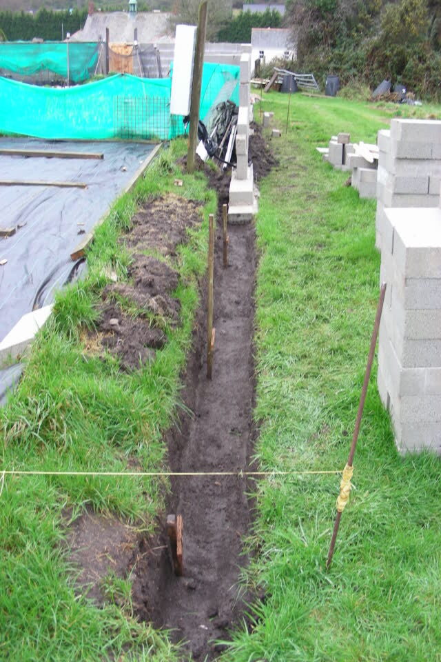 From the above photo, you can see the line of trench follows on from the main wall and will be the West side of the hut foundation. The other three sides are still to excavate but it has been miserably wet over the last few weeks and little has been done on this task. Until this is done work will not progress on the foundation as the block base needs to sit on the concrete.